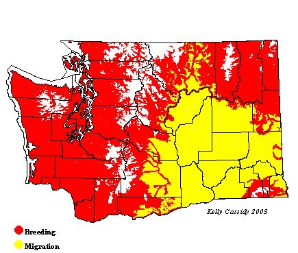 Willow Flycatchers are common in appropriate habitats such as clear-cuts, to elevations of at least 3,000 feet on both sides of the Cascades. They are rare along the outer coast and uncommon on the western side of the Olympic Peninsula. Migrants and non-breeders are sometimes seen in the Columbia Basin.