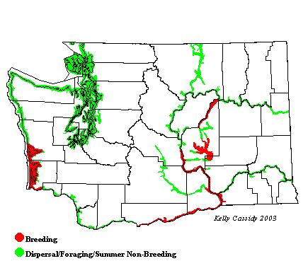 Caspian Terns are most common in the nesting season in the Columbia River estuary (Wahkiakum and Pacific Counties) where the majority of the Washington population nests. A small colony has nested on the Asarco Superfund site on Commencement Bay in southern Puget Sound. During the breeding season, non-breeders can be found in bays and estuaries along the coast and in the Puget Sound region. The birds start leaving the breeding colonies in late June and July, but can be seen through October. In spring, birds first start appearing in late March and April.