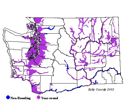 With the widest distribution of any grebe found in the Western Hemisphere, Pied-billed Grebes are common in freshwater wetlands with marshy, emergent vegetation at lower elevations throughout the state, with the exception of the lower slopes of the eastern Cascades. Although they have been known to nest even in city parks such as Seattle's Green Lake and Union Bay Natural Area, while breeding they are secretive and can be difficult to locate. In winter resident populations increase as local birds are joined by northern migratory birds, which begin arriving in western Washington in September and October. Eastern Washington migratory breeders are typically gone by December and return in late March or early April.
