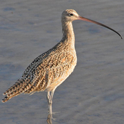 The Long-billed Curlew is the largest North American shorebird. It has a very long, decurved bill, which is longer on adult females than on males and juveniles. It is mottled brown overall, with cinnamon underwings. Sometimes a striped head pattern is evident, but it is far less pronounced than the head stripes on the Whimbrel. It is similar in size, shape, and color to the Marbled Godwit, but the curlew's decurved bill distinguishes it from the upturned bill of the Marbled Godwit.