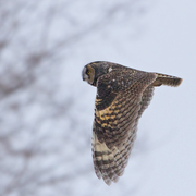 Long-eared Owls are brownish-gray, medium-sized owls with long ear-tufts, hence the name. They have distinctive rufous-orange facial disks. They are mostly gray above, with dark and russet patches at each wrist, conspicuous in flight. Below, wings are mostly buff, and the patches at the wrists are dark. Long-eared owls are barred and streaked with dark brown and rufous on their breasts and bellies. In flight they can be hard to tell from the closely related Short-eared owls, except by behavior and habitat.