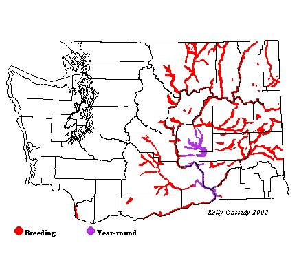 Yellow-headed Blackbirds are common breeders in wetlands within the steppe zone of eastern Washington from early April to September. They are uncommon but becoming more numerous in this area the rest of the year, especially at feedlots in the Columbia Basin and at Moses Lake. In western Washington, they are becoming more common, but are still patchily distributed. They have bred at Fort Lewis (Pierce County), Deer Lagoon on Whidbey Island (Island County), Ridgefield National Wildlife Refuge (Clark County), and Wiser Lake (Whatcom County). Migrants and non-breeders are often seen in western Washington as well, and may occasionally turn up at the Union Bay Natural Area (the Montlake Fill) in Seattle.